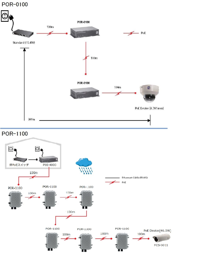 | POR-1100 | 屋外用PoE 受電受給電中継リピーター |