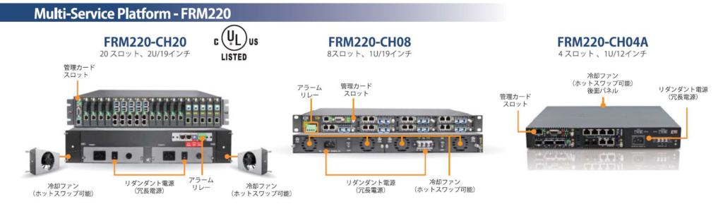 FRM220シリーズには、2U 20スロット(FRM220-CH20)、1U 8スロット(FRM220-CH08)、及び1U 4スロット(FRM220-CH04A)の3つのタイプの集合シャーシがあります。